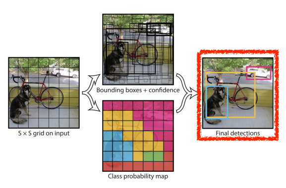 Faster R-CNN는 바운딩 박스를 찾는 region proposals network 가 있었고 거기서 나오는 바운딩 박스를 따로 분류하였음. 그러나 YOLO는 한번에 분류
